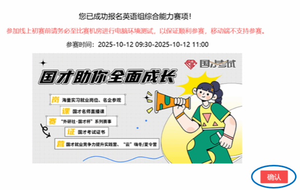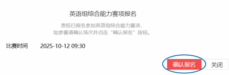 选手填完基本信息后,请点击相应比赛报名按钮,进入报名弹窗,点击“确认报名”,方视为报名成功。下面以英语组综合能力赛项为例,展示报名流程。