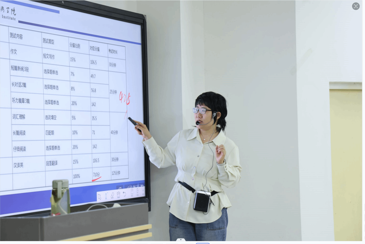 讲座伊始,李玉冰老师带领同学们初步了解四级考试的考试时间、题型分配以及做题顺序等。接着,李玉冰老师对写作、听力、阅读和翻译四大题型进行了深入浅出的技巧分享,并结合历年真题加以实践磨练。李玉冰老师重点强调了提升基础词汇和语法以及高效利用真题的方法。李玉冰老师讲课方式幽默风趣,大大激发了同学们的学习热情,同学们对四级备考策略有了更直观深入地理解,也对四级考试增强了信心。最后,李玉冰老师还为大家详细讲解了四级备考时间规划,引导同学们制定合理的学习计划,设定明确的学习目标,进行高效学习。