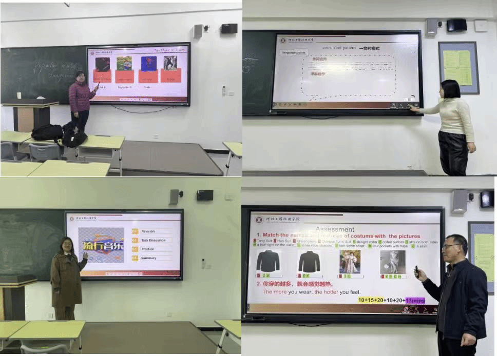 在本次活动中,教研室每一位教师精心打磨,带来了精彩纷呈的教学示范。马丽娜老师的产出式教学有效提高了课堂教学效率;张鑫老师的词汇教学法高效助力学生拓展英语词汇;赖信含老师将艺术生专业特长和英语教学内容进行了巧妙融合;樊晓静老师严谨连贯的教学设计为英语课堂教学活动提供了新思路。在每一场教学展示的热烈氛围中,教师们踊跃参与讨论,各抒高见,相互借鉴,携手探索更加适合艺术类学生的英语教学新策略。