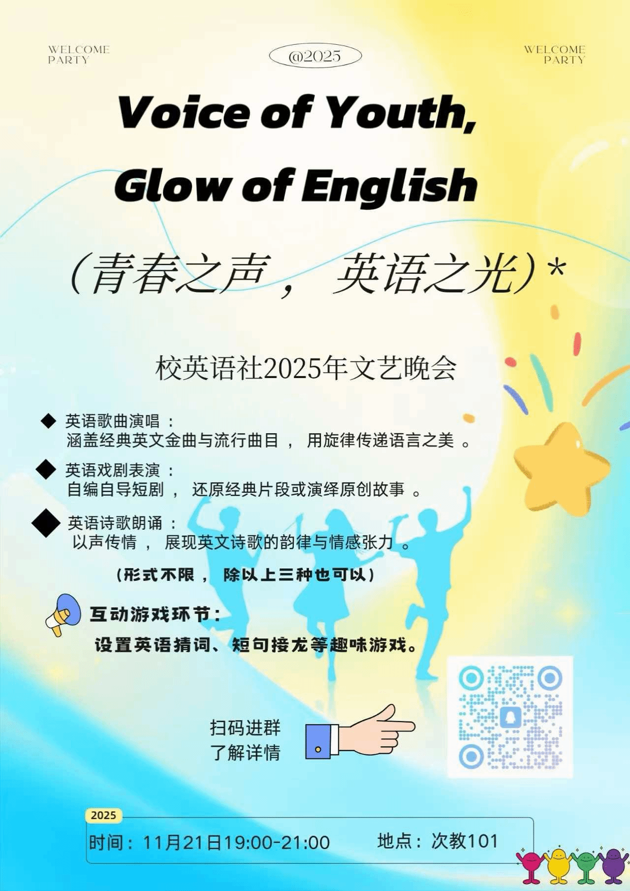 2025-10-21为丰富校园文化生活,激发学生英语学习热情,展现青春风采,我校英语社精心策划的“青春之声,英语之光”(Voice of Youth, Glow of English)主题文艺晚会,将于2025年...[详细]